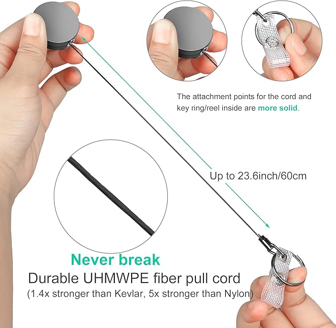 - Unbreakable Cord. Forget annoying cord breaks, the 24.4" UHMWPE fiber cord makes our retractable badge reel more flexible and stronger than steel wire. Unlocking doors has never been this easy.