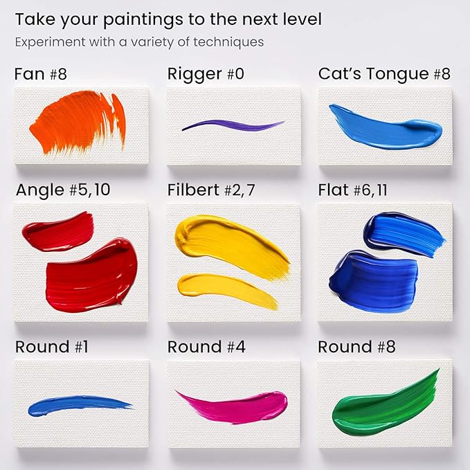 - Set of 12 Oil & Acrylic Paint Brushes: Our Arteza acrylic brushes are designed with versatility in mind. The set includes 3 round (no. 1, 4, 8), 2 angular (no. 5, 10), 2 filbert (no. 2, 7), 2 flat (no. 6, 11), 1 cat's tongue (no. 8), 1 rigger (no. 0), and 1 fan brush (no. 8).