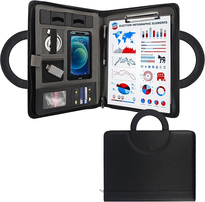 - 【LARGE CAPACITY】Multiple functions portfolio fits 8.5"x11" or A4 documents, a tablet sleeve, a phone/Pad holder, a phone pouch with Visible Window and charger hole, an elastic band for cables, a mesh pocket for USB stick, 6 card slots, a small ticket pocket and a pen holder. Neat and Practical Organized All Your Stuff. This super business binder padfolio is big enough to safely store what you need yet is compact, stylish & travel-friendly.