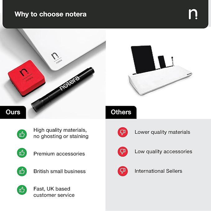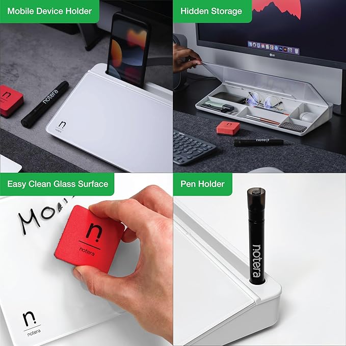- ✅ EMBRACE SUSTAINABILITY - with the Notera desktop whiteboard with storage you can ditch the wasteful sticky notes and planners. Say goodbye to paper waste and hello to our sleek, premium glass desktop dry erase board.