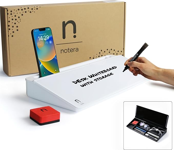 - ✅ ESCAPE PROCRASTINATION - Declutter your desk, regain focus and banish stress with the Notera desk buddy. Store office accessories in the handy internal compartment, use the dry erase desktop whiteboard for notes and the integrated device slot to prop up your mobile devices.