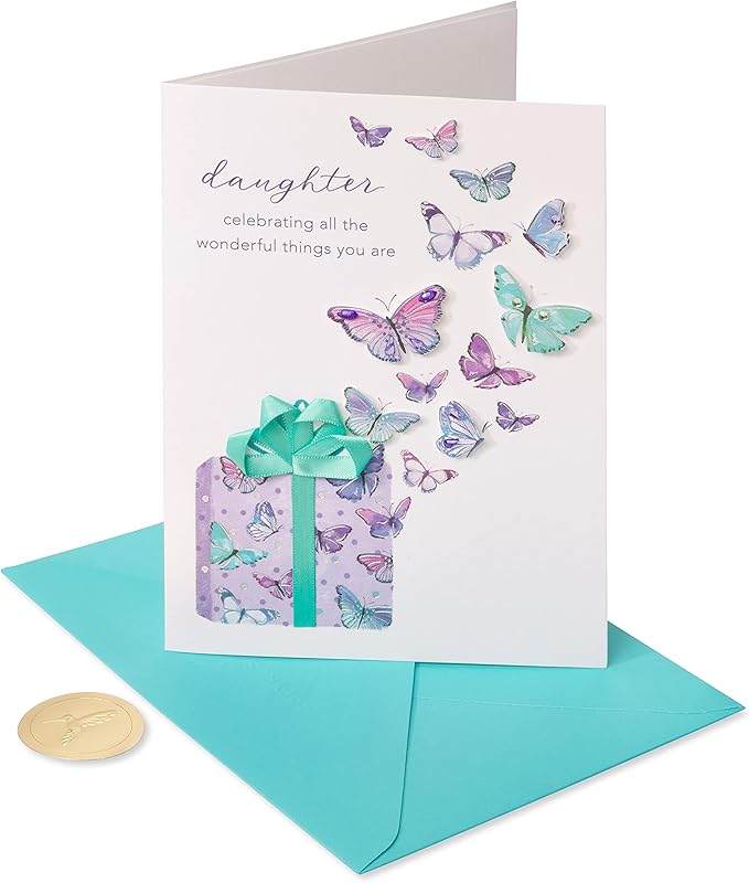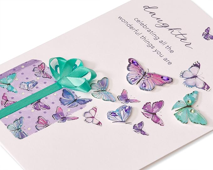 • This beautiful birthday card for daughter by Papyrus features shimmering foil, sparkling gems with ribbon and paper attachments