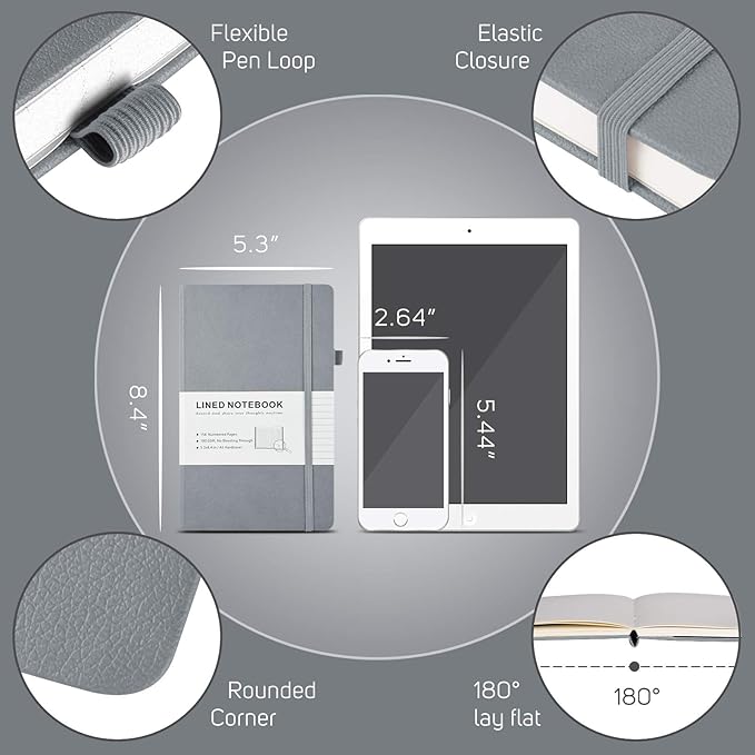 - Handy All-in-one Journal: Medium notebook, 5.3" x 8.4", suitable in bag and handy in hand; 1 Solid expandable back pocket and 1 front pocket for loose leaf paper, bills, receipts; 1 Elastic pen loop for various szies’ pens; 1 Elastic band to keep notebook closed.