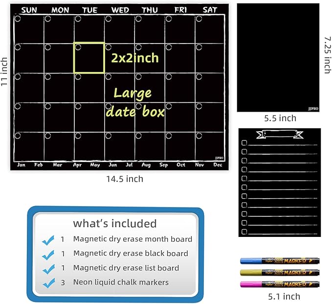 - EFFECTIVE COMBO SET: JJPRO monthly planner set includes one 14.5”x11”magnetic monthly calendar and two 7.25”x 5.5”magnetic blackboards. The combo set fits most refrigerators, no matter its mini or full size, single door or side-by-side. Flexible sizes provide more options to choose and convenience to use.