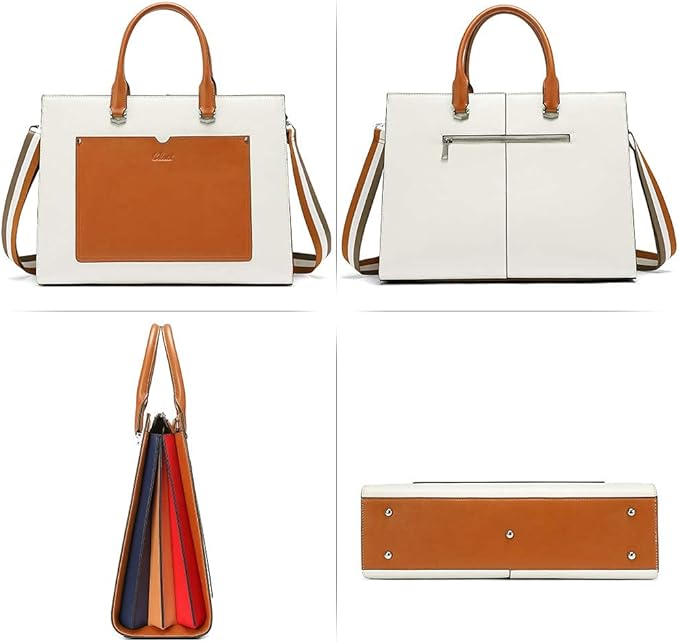 - [Premium Quality]:The stylish leather women briefcase is made of vegan leather. Match with rust-proof silver metal hardware and colorful side design for durability and fashionable. Inner coffee fabric lining soft to touch. Classic design is perfect for office, travel and formal.