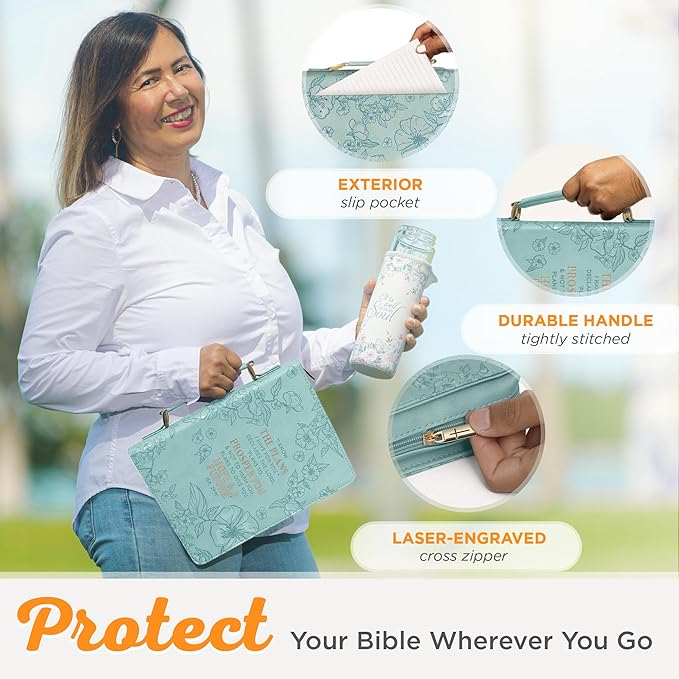 - Durable: Protect your Bible from life’s mishaps with this teal/turquiose fashion Bible cover for women made from sturdy faux leather material that is easy to clean and will withstand daily wear. This motivational Bible cover is a superb way to travel and easy to carry with you wherever you go.