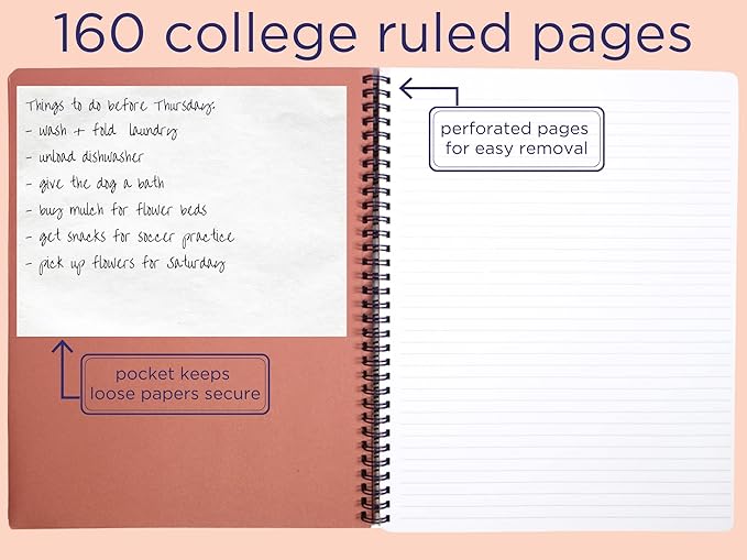 - INCLUDES 160 PAGES: Spiral notebook includes 160 high-quality, lined pages that withstand ink bleed-through; pages feature college ruled lines with a perforated edge to easily take to-dos, notes, and reminders on-the-go