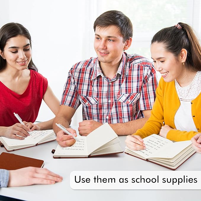 - Feela 3 Pack Classic Ruled Notebooks contains 3 classic brown ruled sturdy cover notebooks and 3 Black Retractable Pens. Each of the notebooks measures 8.3” x 5.1”, which is perfect to carry and easily held by young girls and boys. These black cute pens are customized to be placed in the pen holder, which is pretty convenient.