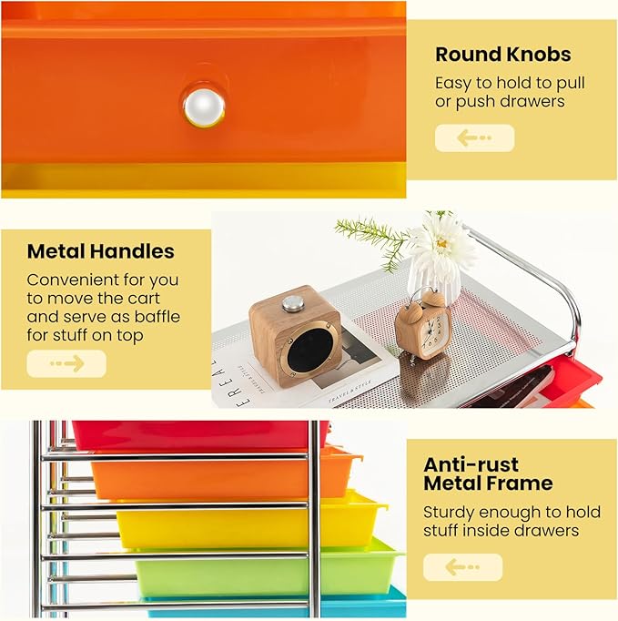 - Durable Metal Frame: The frame of this drawer storage cart is constructed of high-quality metal and processed with smooth chrome finish. The cart is sturdy and can provide long time service. In addition, the drawers are made of premium plastic but lightweight. Given the moving of cart, the whole weight of the cart is light.