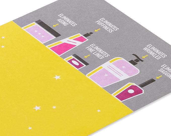 • This birthday greeting card for her features a bright yellow starry background and cosmetic products with swirl designs and raised detailing on quality cardstock