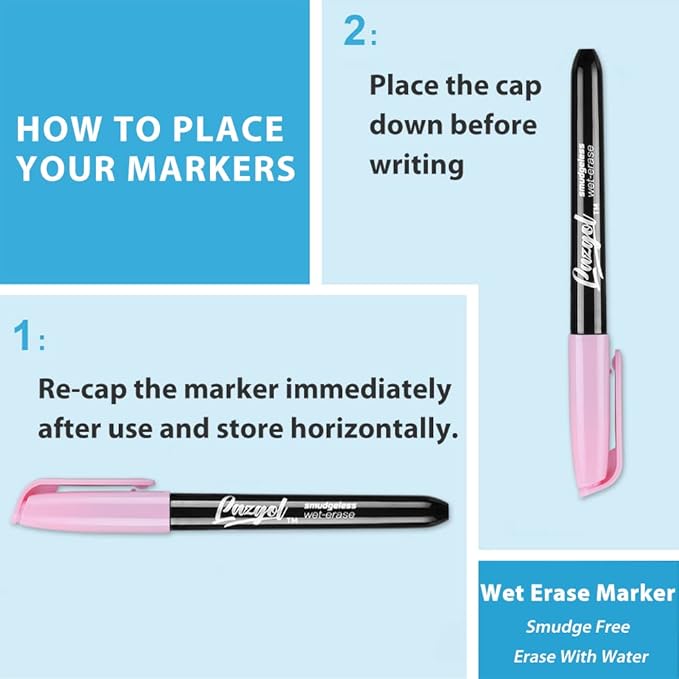 - HOW TO PLACE THESE MARKERS: Place the cap down before writing and Re-cap the marker immediately after use then store horizontally.
