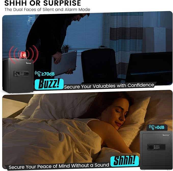 - POWERHOUSE OF SAFETY, DUAL ALARM MASTERY - Safety is our middle name! The Kavey Home Safe's dual alarm system is like having a personal security guard on duty. Three wrong password attempts or any unwelcome force will unleash a 70-decibel alarm that echoes through your space, scaring off even the boldest of intruders.