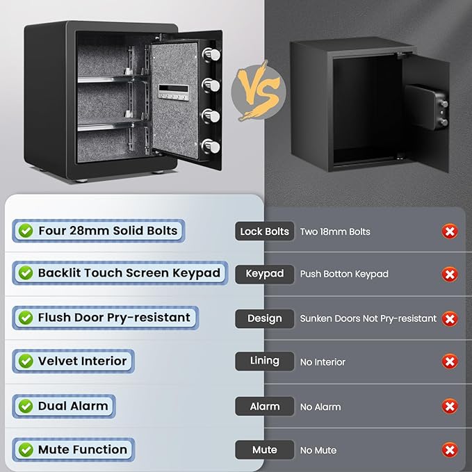 - MAXIMUM SECURITY FOR YOUR VALUABLES - Looking for a ultimate safe box to protect your belongings? The Kavey Safe is built like a fortress with premium low-carbon alloy steel, a 6cm-thick anti-drill door, and a 1mm anti-pry seam. Featuring four 28mm anti-theft bolts, it offers unbeatable protection against burglars and curious hands. Keep your cash, jewelry, documents, and more safe with confidence!