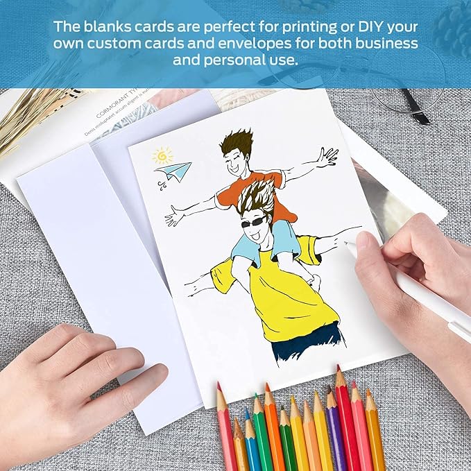 - Professional Quality: Envelopes and cards are made with eco-riendly white paper, designed to give each envelope and card a sleeker and more elegant feel. These cards are made of heavyweight strong cardstock. Each card is pre-scored and made of heavy weight 300 GSM cardstock (110 lb Cover = 200 lb Text = 300 GSM) that feels thick and sturdy. Envelopes are 120 GSM weight, no see-through worries, protect your information. 100% acid-free, perfect for drawing and stamping.