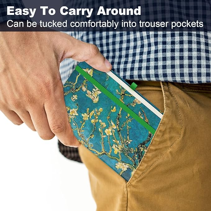 - Pocket Hardcover Notebook: The cute A6 mini notebooks measures 3.9x5.7inch. Fits in back pocket, shirt pocket or purse well. Includes 160 pages ivory thick paper, 1 ribbon bookmark, 1 inner pocket, 1 Pen Holder loop and 1 elastic closure band