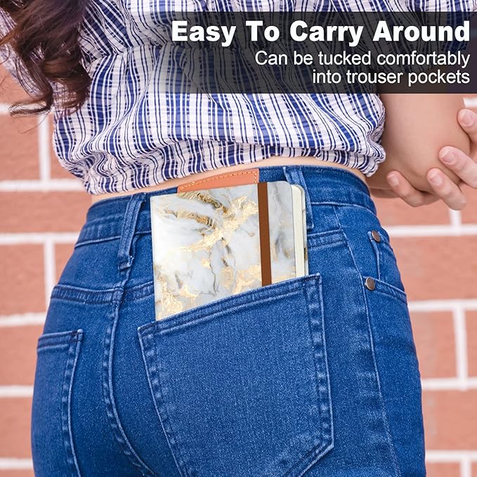 - Pocket Hardcover Notebook: The cute A6 mini notebooks measures 3.9x5.7inch. Fits in back pocket, shirt pocket or purse well. Includes 160 pages ivory thick paper, 1 ribbon bookmark, 1 inner pocket, 1 Pen Holder loop and 1 elastic closure band