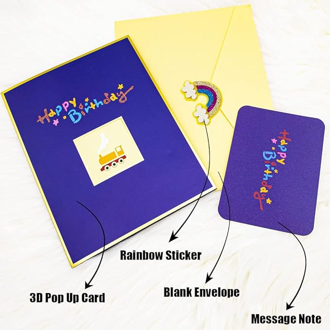 - [PACKAGING INCLUDED] 1x unique train pop-up card with glittering "Happy Birthday" cover design, 1x inserted blank writing card (hidden in the greeting card, to write your warm wishes), 1x high-grade butter-yellow envelope, what’s more, 1 x rainbow sticker for sealing (make the card perfectly ready to send to your loved one, no need to worry about how to seal the envelope without spoiling its’ beauty.)
