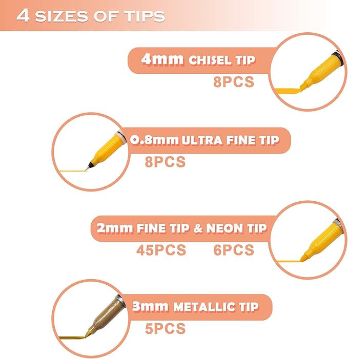 - 🖍️NOTES: To increase the life of ink, please cover the pen cap in time after use, pay special attention to placing metallic markers horizontally after use.