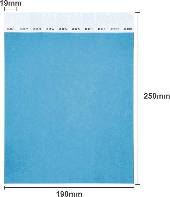• Blue wristbands are10" long and 3/4" wide. A piece of paper is 10 wrist straps. 100 wristbands have 1-100 consecutive numbers.