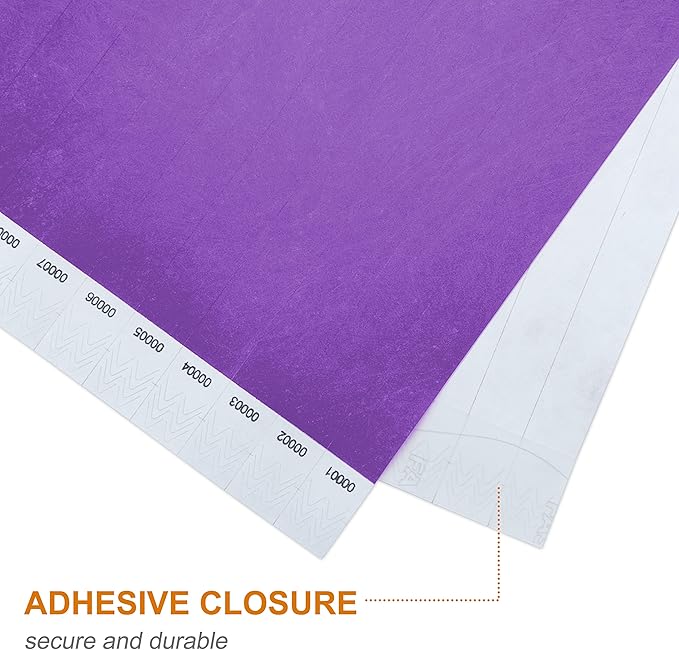 • Purple wristbands are10" long and 3/4" wide. A piece of paper is 10 wrist straps. 100 wristbands have 1-100 consecutive numbers.