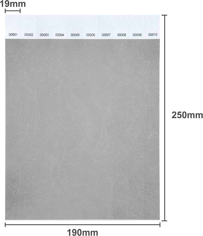 • Silver wristbands are10" long and 3/4" wide. A piece of paper is 10 wrist straps. 100 wristbands have 1-100 consecutive numbers.