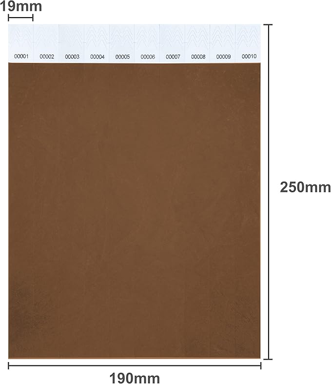 • Brown wristbands are10" long and 3/4" wide. A piece of paper is 10 wrist straps. 100 wristbands have 1-100 consecutive numbers.