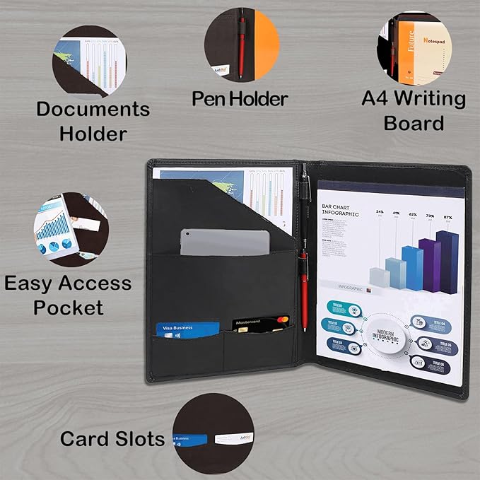 - { PROFESSIONAL BUSINESS PADFOLIO } – Black leather portfolio is a perfect choice for you. It can be your partner in office, school or other working places and helps you to manage a4 size document like resume or etc.