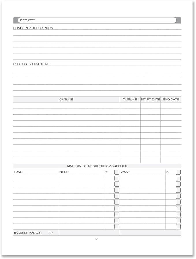 • There are 2 pages for each project with spaces to write out concept, purpose, outline, timeline, budget, and other important information