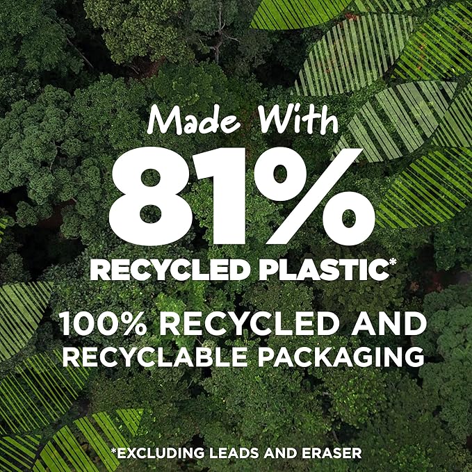 - Each mechanical pencil is made from 81% recycled plastic excluding leads and erasers and the paperboard packaging is made of 100% recycled content and is recyclable