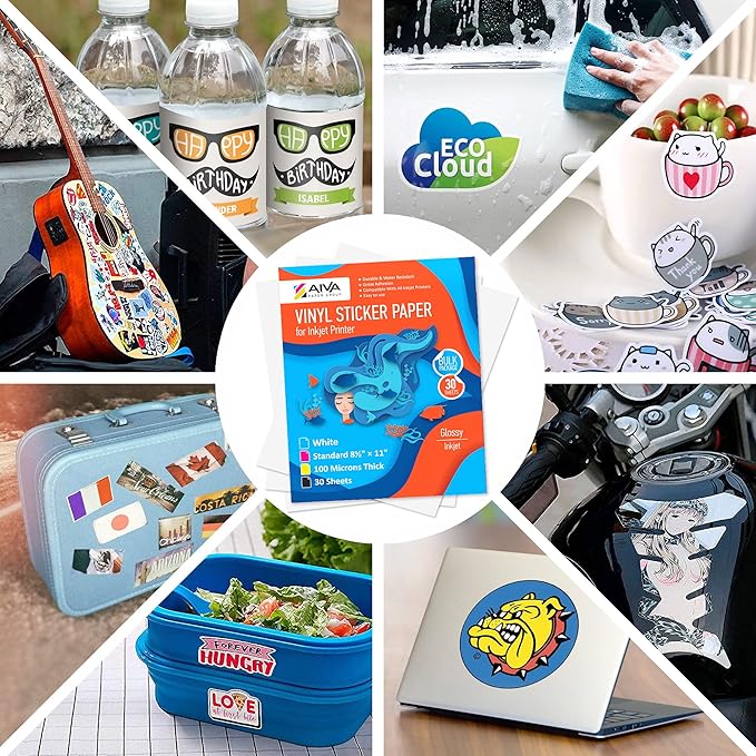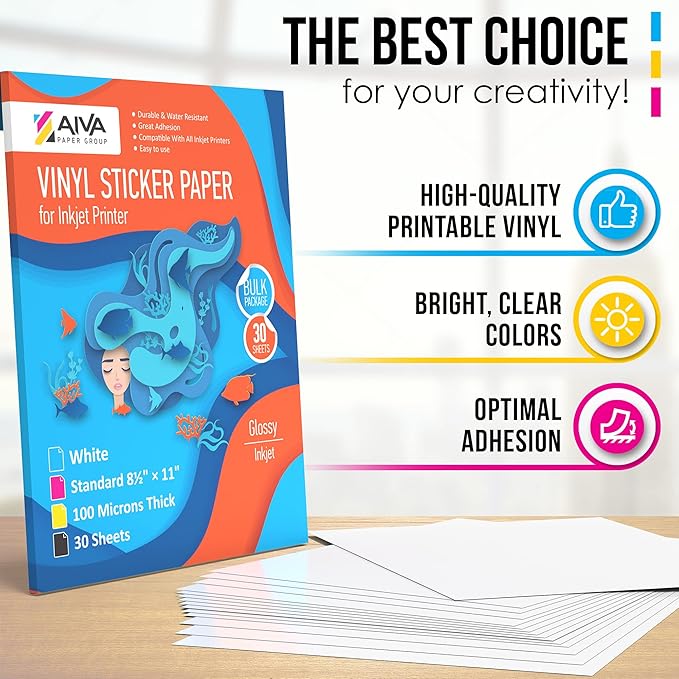 - High-Quality Printable Vinyl Paper - set includes 30 white vinyl sheets of Printable Sticker Paper for printer, Glossy finish. US Standard Letter Size - 8.5"x11". Suitable for High resolution and clear image quality