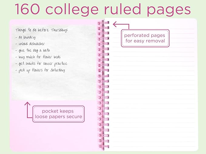 - INCLUDES 160 PAGES: Spiral notebook includes 160 high-quality, lined pages that withstand ink bleed-through; pages feature college ruled lines with a perforated edge to easily take to-dos, notes, and reminders on-the-go