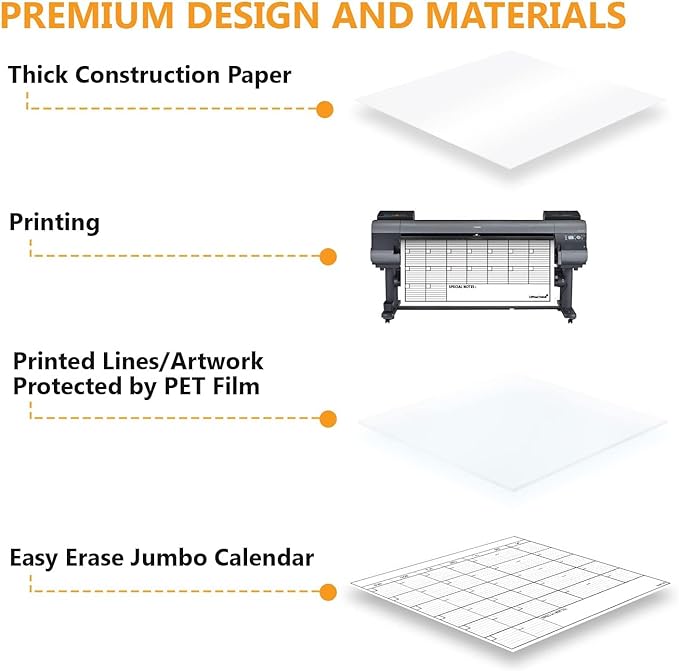 - EASY BREEZY ERASING: We developed a unique PET Film that years later will easily erase dry and wet erase markers. So, go ahead and use as many colors and thick lines as you want on this calendar because erasing is a breeze.