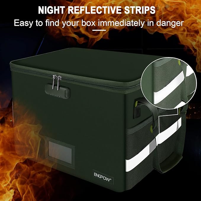 - Anti-static and reflective strip design:Are you still worried about the storage box is often covered with dust? The anti-static material can prevent dust from sticking to the outside of our fireproof box, always keep it neat and tidy.The reflective strip design on the side of the box allows you to immediately find your fireproof box even at night, protecting irreplaceable documents and valuables from fire.