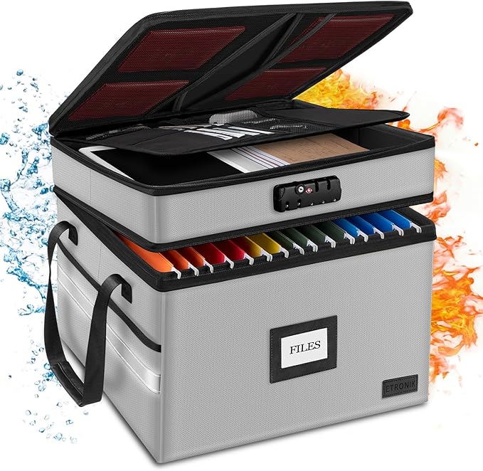 - [Portable Fireproof Storage Box] With lighter and sturdy handles, our fireproof box can be moved and carried more easily. You can use it in many places like home, office, car or outdoor activities. The inside of the filing box is supported by PP material, which is not easy to deform, so you can easily fold or stack multiple boxes together