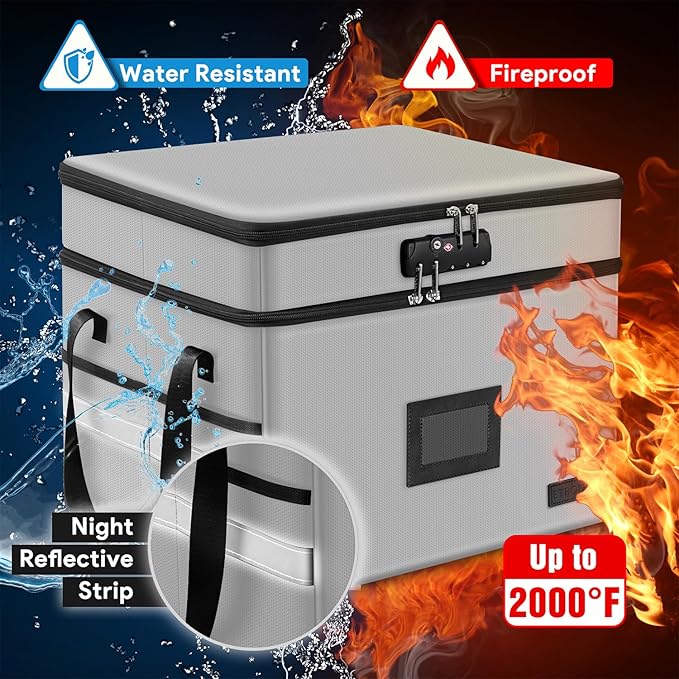 - [High Quality Fireproof Document Box]- Made of double-layered non-itchy silicone coated fiberglass, our filing box is fireproof and waterproof to protect your document at most in bad condition like fire, flood and wet weather. The design of High-quality 2 ways zipper provides great convenience when using. The non-slip pad on the bottom makes the document box more stable