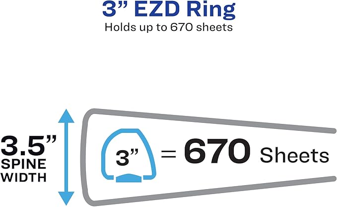 - White heavy-duty binder features 3 inch One Touch EZD rings, 3.5" tear-resistant DuraHinge spine, DuraEdge split-resistant edges, 4 clear interior pockets and customizable covers and spine