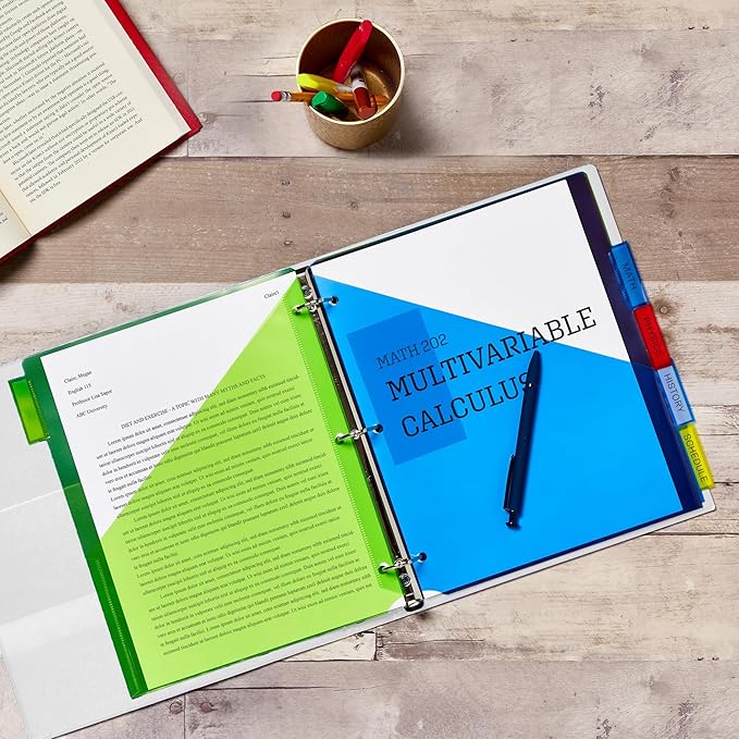 - Set of school supplies includes one Durable View Binder with 1 inch slant rings (17012) + one set 5 Tab Two-Pocket Plastic Dividers (11906) + one pack Assorted Color Highlighters (24063)