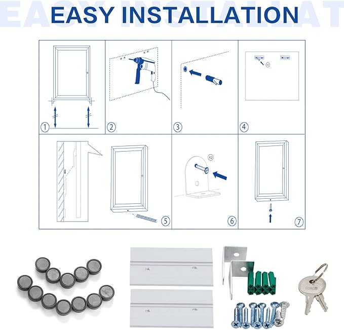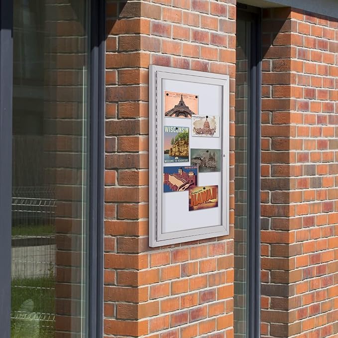 - 💧OUTDOOR USE —The weather-resistant cabinet construction features an aluminum frame with a smooth surface and full-length piano hinges that add strength and durability to the door frame. Drain holes on the bottom and a sealed backing mean you can mount the board outdoors.