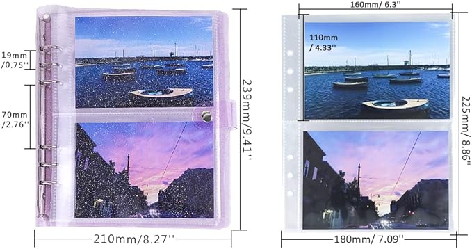 - 4.MEASUREMENT--180mm x 225mm(7.09" x 8.86") photo album pages and 210mm x 239mm(8.27" x 9.41") 6 ring photo sleeve binder. The 160mm x 110mm(6.3" x 4.33") Pockets perfect for 6inch or small photos and cards, 2 pockets per page. You can easily insert photos and cards in the photo sleeves.
