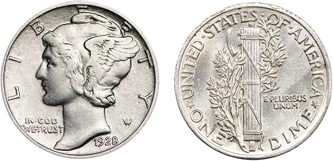 - The Coin-A Mercury Dime coin minted from 1916 to 1945 displays Miss Liberty wearing a winged cap displayed on the obverse side and represents freedom of thought. Years and mint marks will vary.