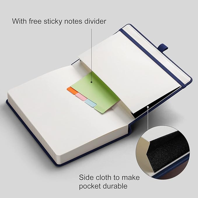 - Humanized Design: Numbered pages, divider sticky notes, index content pages, and 2 bookmarks help you find important content faster. Durable PU leather hardcover protects the ruled notebook from wear and tear. Back inner pocket can hold notes, business cards, small gadgets, etc. Closes with an elastic band and pen holder loop for any pen