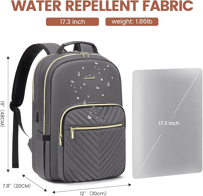 - 💯【Upgraded Laptop Backpack Women】: Classic V-shaped embroidery thread. Upgraded double LOVEVOOK no-slip metal zippers,water resistant Nylon fabric with polyester lining, ensures long lasting usage. Total of 4 compartments and 16 pockets for your computer,A4 folder,bottles,umbrellas,clothes,work supplies,college supplies and travel essentials.Dimensions: 12"L 19"H 7.8"D, Weight: 1.86lbs.