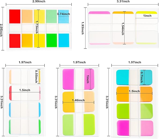 - [PACKAGE INCLUDES] Sticky tabs: 19 colors, 5 styles(wide:4X3 colorsX24 sheets, long:2X5 colorsX20 sheets, light color:4X4 colorsX24 sheets), 10 pieces in a pack, a total of 872 sheets, a mix of 0.47 in.,0.7 in. and 1 in. widths. The self-adhesive part is transparent.