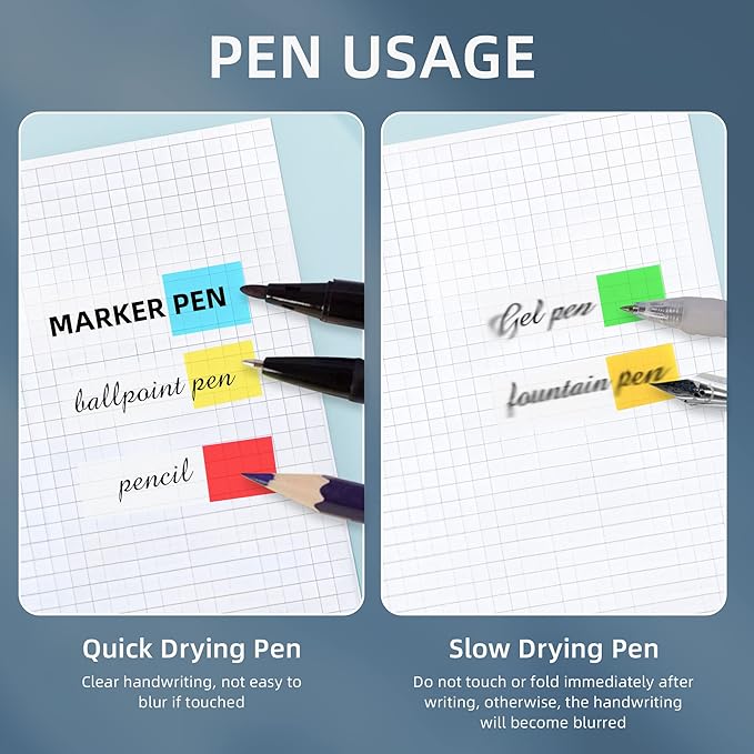 - [WRITABLE AND POSITIONABLE] The label is half self-adhesive, and can be repositioned for easy pasting and marking, and clean up. Different pens bring different effects to the sticky notes, (easy-dry pens: ballpoint pens, pencils, markers; difficult-to-dry pens: fountain pens, gel pens, ink-based pens, etc).