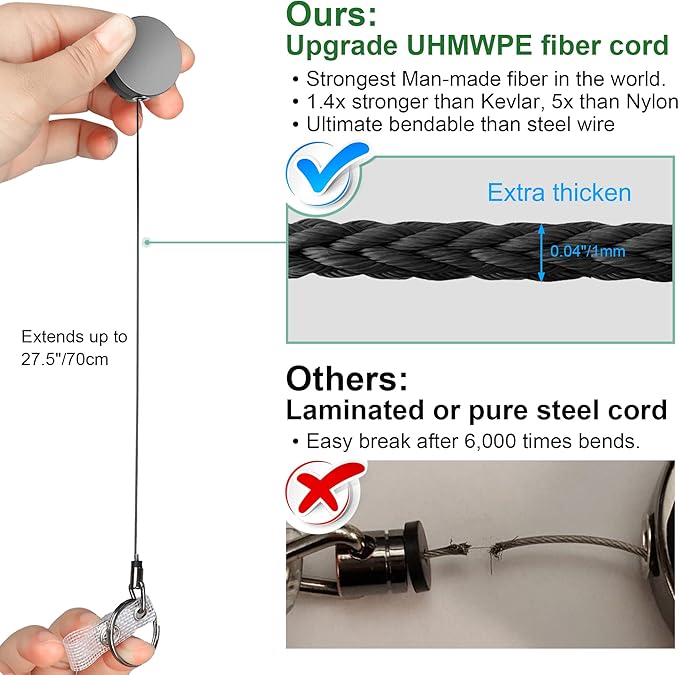 - Unbreakable Cord. Forget annoying cord breaks, the 27.5" UHMWPE fiber cord makes our retractable badge reel more flexible and stronger than steel wire. Unlocking doors has never been this easy.