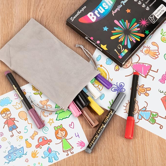 SMOOTHERPRO 12 Acrylic Paint Pens, Brush Tip (1-6mm) Acrylic Paint Markers, Fabric Markers for Textile, Canvas, Rock, Glass, Wood, Paper, Pumpkin, DIY
