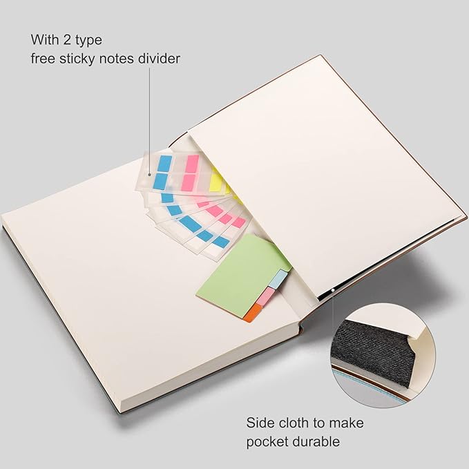 - Humanized Design: Divider sticky notes and 2 bookmarks help you find important content faster. Durable PU leather softcover protects the ruled notebook from wear and tear. Back inner pocket can hold notes, business cards, small gadgets, etc. Closes with an elastic band for maximum privacy