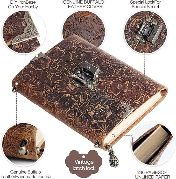 - 【COMPACT SIZE】This journal measures 8 inches x 5.5 inches x 1.5 inches, has a flower embossed cover and a vintage locking clasp to protect your secret. And is compact for carrying in the bag and is an ideal size for a leather notebook, sketchbook.