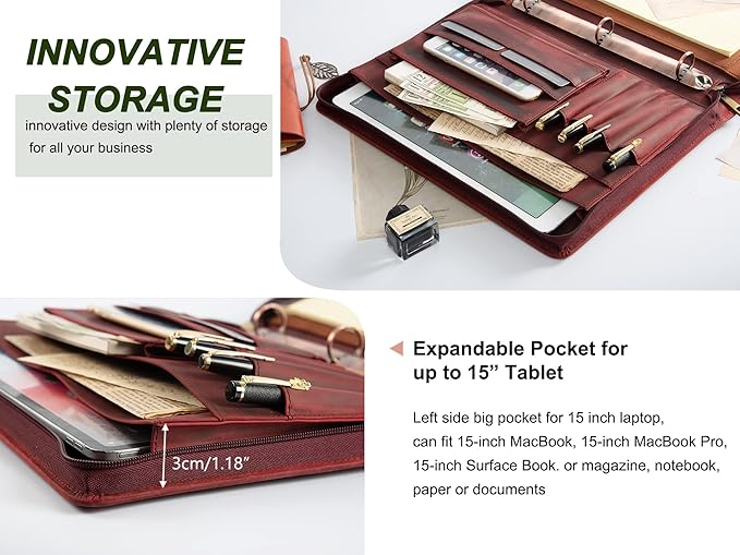 - SLEEK & STUNNING IN HAND – COMPACT FOR TRAVEL – Leather folder looks gorgeous held in hand walking into the board meeting, Law School, or interview while sliding neatly into handbags, backpacks while MAINTAINING FAR GREATER STORAGE than traditional leather planners. Easy Organize loose pages, documents, letters, business cards, photos etc.