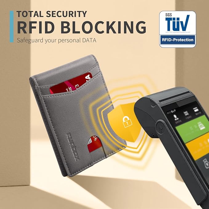 • RFID Blocking - Our wallets are equipped with advanced RFID SECURE Technology, a unique metal composite, engineered specifically to block 13.56 MHz or higher RFID signals and protect the valuable information stored on RFID chips from unauthorized scans. License and ID cards will be protected effectively. Blocking the 13.56 MHz band and protect against data theft by RFID scanners